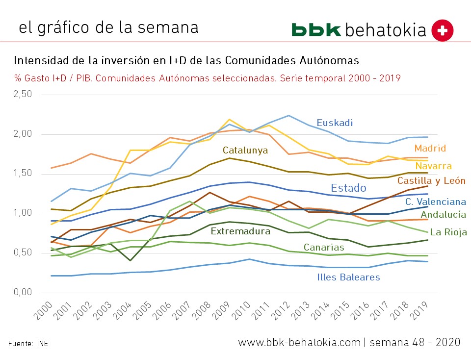 Los datos del INE permiten seguir la evolución comparada de la inversión en actividades científicas y tecnológicas en las dos últimas décadas en las Comunidades Autónomas y en el conjunto del Estado.
