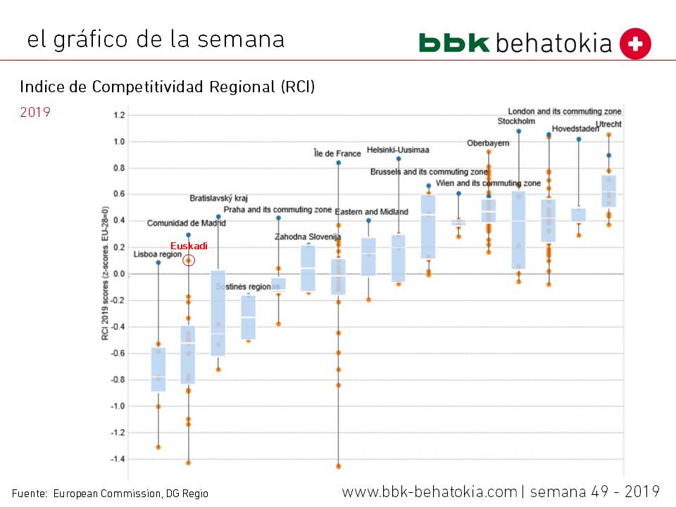 Euskadi, que ocupa el puesto nº 50 en términos de PIB per cápita, ocupa la posición 125 en el ranking de competitividad, superando la media de la UE-28 en 0,10 puntos.