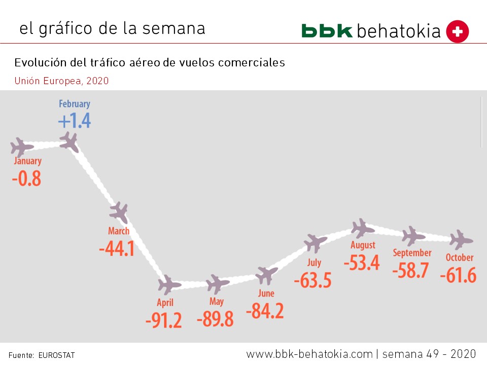 EUROSTAT ha publicado los últimos datos disponibles sobre la evolución del tráfico aéreo de vuelos comerciales en 2020. El primer impacto fue visible en marzo de 2020, con una disminución del 44% en el número total de vuelos comerciales (pasajeros, carga y correo) en la UE en comparación con el mismo mes de 2019. Con las restricciones COVID-19 en pleno efecto y cambios en preferencias de viaje, las caídas más sustanciales en el número de vuelos comerciales se registraron en abril (-91% respecto al mismo mes de 2019), mayo (-90%) y junio (-84%).