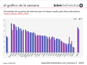 En general, la participación en la educación en línea en 2023 aumentó en comparación con 2022. La proporción de personas que realizan cursos en línea o utilizan material de aprendizaje en línea aumentó en la mayoría de los países de la UE, registrándose el mayor aumento en los Países Bajos (+12 pp), Suecia (+7 pp) y Malta, Estonia y Croacia (los tres +5 pp). Se observan descensos en Grecia (-12 pp), Chipre (-5 pp), Austria y Eslovenia (ambos -2 pp).