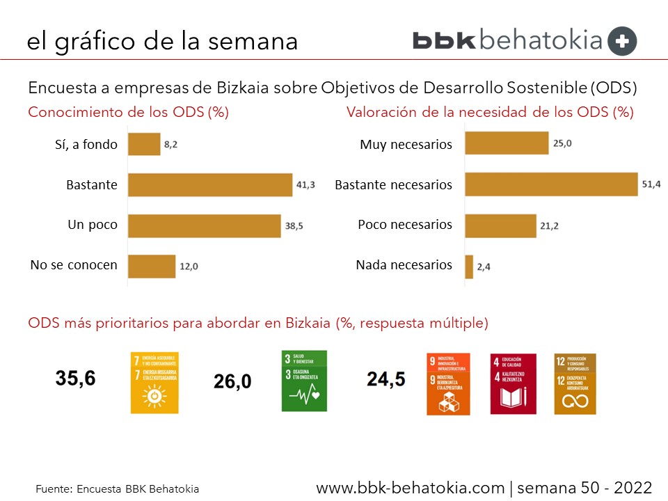 Cuando procedemos a explorar en torno a los ODS entre las empresas del TH aparece el ODS número 7 como el prioritario a implantar y desarrollar en Bizkaia. Energía asequible y no contaminante es la prioridad para más de 1/3 de las empresas del TH. A bastante distancia aparece otro grupo de ODS que logran el consenso de 1 de cada 4 empresas para ser consideradas prioridades a implantar en Bizkaia. Serían los ODS 3, 12, 9 y 4, es decir Salud y bienestar, Producción y consumo responsables, Industria, innovación e infraestructuras y educación de calidad.