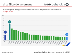La cuota de las fuentes renovables en el consumo final bruto de energía a nivel de la UE alcanzó el 23,0% en 2022. En comparación con 2021, esto representa un aumento de 1,1 puntos porcentuales (pp).