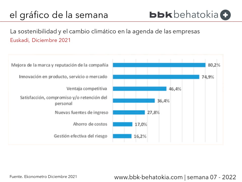 Ante la cuestión sobre en qué ámbitos es más relevante para las empresas vascas la actividad económica sostenible y la lucha contra el cambio climático, la mayoría de los y las economistas, un 80,2%, opina que “son relevantes para la mejora de la marca y la reputación de la compañía”, mientras que casi el 75% de las personas encuestadas considera que son planteamientos relevantes por “la innovación en producto, servicio o mercado”.