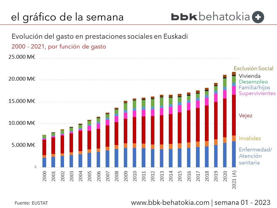 EUSTAT ha publicado los datos de gasto en protección social correspondientes a 2021 en Euskadi, que superó los diez mil euros (10.085) por habitante, un 3,2% más que en 2020 y un 13,1% más que en 2019, según datos elaborados por Eustat. En términos absolutos, el gasto se situó en 22.084 millones de euros, 620 millones más que en 2020. Estas cifras computan gastos e ingresos de los sistemas de protección social realizados en la C.A. de Euskadi por cualquier organismo, público o privado.