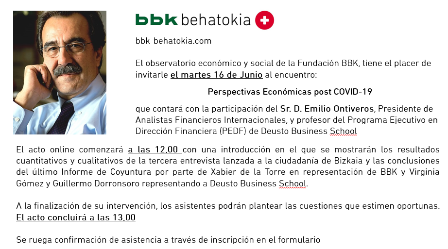 El próximo martes 16 de junio, de 12,00 a 13,00, BBK Behatokia organiza un Encuentro online con los agentes económicos y sociales de Bizkaia, en el que presentará las conclusiones de su último Informe de Coyuntura, así como los resultados de la tercera oleada de la «Encuesta de percepción ciudadana sobre COVID 19 en Bizkaia».