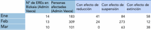 Los EREs con efecto de reducción afectaron a 22 personas, manteniéndose en niveles moderados. La suspensión de contratos fue el mecanismo más utilizado, con 140 trabajadores afectados (70% del total). Por último, los despidos colectivos impactaron a 36 personas, mostrando un ligero aumento respecto a marzo de 2025 pero aún por debajo de los picos de 2024.