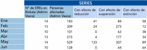 En cuanto al tipo de medidas adoptadas, los EREs de reducción afectaron a 137 personas en mayo, el valor mensual más alto del semestre, mostrando que algunas empresas optaron por ajustes de jornada en lugar de suspensiones o despidos. Las suspensiones de contrato se mantuvieron como el mecanismo más frecuente, especialmente en abril y mayo, con un total de 548 trabajadores afectados en el trimestre. Por último, los despidos colectivos tuvieron cierta relevancia en junio, con 64 casos, lo que representa el 22% de las personas afectadas en ese mes.