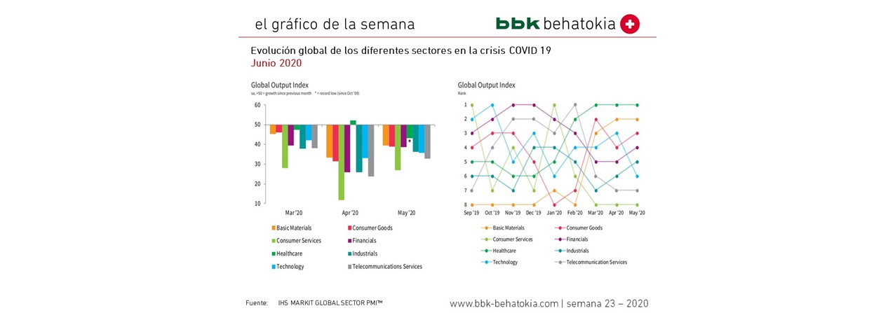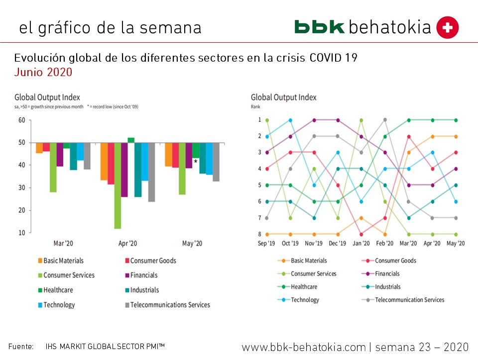 “Global Sector PMI” sektore-indizeak hilero sortzen dira, mundu osoko erosketa-zuzendariei sektore guztietan (lehengaiak, kontsumo-ondasunak, kontsumitzailearentzako zerbitzuak, finantzak, osasuna, industria, IKTak, zerbitzuak) bidalitako galdetegiei emandako erantzunetatik abiatuta. Beraz, oso modu osoan erakusten dute COVID krisiak horietako bakoitzean merkatu globaletan izan duen eragina.