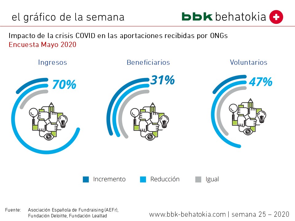 Azterketa horren ondorio nagusien artean, nabarmentzekoa da Espainiako irabazi-asmorik gabeko erakundeen %70ek aurreikusten duela diru-sarrerak murriztuko direla koronabirusak sortutako krisiaren ondoren; erakundeen %33k, berriz, onuradunen kopurua handitu du, eta, beraz, jardueraren gastuak ere bai. Hala ere, boluntarioen kopurua %47 murriztu da konfinamenduan.