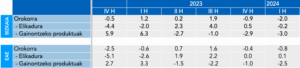 Bizkaian, salmentak % 2,0 jaitsi ziren lehen hiruhilekoan, 2023ko aldi beraren aldean. Elikadura ia egonkor mantendu zen (-%0,2), eta gainerako produktuak % 3,0 jaitsi ziren, emaitza orokorra arrastatuz.