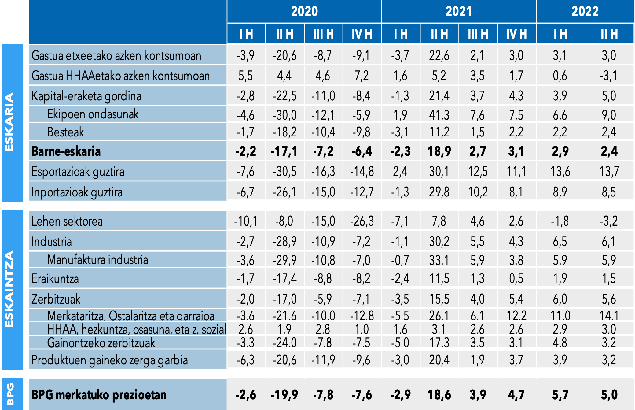 EUSTATek argitaratutako datuen arabera, eskariari erreparatuz eta iazko hiruhileko berarekin alderatuta, aztertutako partida guztiek goraka egin dute, HHAAetako azken kontsumoko gastuak izan ezik. Haien artean, ekipoen ondasunak eta kanpo merkataritza nabarmendu daitezke.