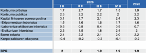 Aurreikuspen hauek adierazten dute euskal ekonomia modu orekatuan hazten jarraituko dela 2026an, kontsumoak, inbertsioak eta sektore publikoaren egonkortasunak sostengatuta.