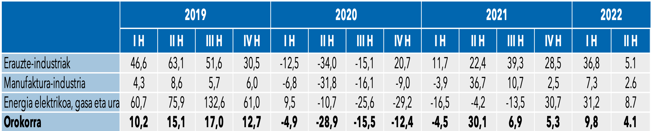 Euskal Estatistika Erakundeak (Eustat) argitaratutako datuen arabera, aztertutako hiru sektoreek, erauzte-industria, manufaktura-industria eta energia elektrikoa, gasa eta ura, bilakaera onuragarria adierazi dute 2022eko bigarren hiruhilekoan aurreko urteko hiruhileko berarekin alderatuz, indize orokorraren joera bera erakutsiz.