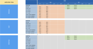 BJAren arabera, tasa %59,8koa da gizonen artean eta %51,2koa emakumeen artean, zortzi puntu inguruko aldea mantenduz. 25 eta 44 urte bitarteko pertsonen artean (%88,5) eta goi-mailako ikasketak dituztenen artean (%75,7) da jarduera-maila altuena.