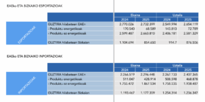 Bestalde, inportazioak %6,2 igo ziren urte arteko tasan, 2.407 milioi eurora iritsiz. Energiaz kanpoko ondasunen erosketak %10,2 handitu ziren, eta produktuen energetikoenak %7,8 jaitsi.