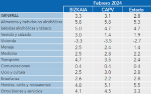 Estatistikako Institutu Nazionalak (EIN) urtarrilean argitaratutako datuen arabera, Bizkaiak, EAEk eta Estatu osoak % 3.3, % 3.1 eta % 2,8ko urte arteko aldakuntza-tasa dute, hurrenez hurren. Azpimarratu behar dugu elikagaien sektorea oso eragin-talde esanguratsua dela aztertutako hiru lurraldeetan. Hala ere, etxebizitzaren eta energiaren sektorea harrigarria da hainbat alditan lehen aldiz izatea, termino positiboetan.