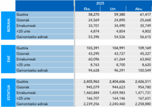 Eustatek eta INEk argitaratutako azken datuen arabera, 2025eko udan erregistratutako langabezia, Bizkaian, ekainean 58.270 langabe izatetik abuztuan 61.417 izatera igaro zen, eta udaldian igoera txiki bat izan zen. Antzeko joera ikusten da EAEn, hilabete horietan 103.391 langabe izatetik 109.169 izatera igaro baitzen. Igoera hori kontratuak amaitzeari egotz dakioke.