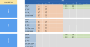 BJAren arabera, tasa %55,7koa da gizonen artean eta %47,8koa emakumeen artean, zortzi puntu inguruko aldea mantenduz. Enplegua handiagoa da 25 eta 44 urte bitarteko pertsonen artean (%81,6) eta goi-mailako ikasketak dituztenen artean (%72,3).