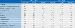 Según datos publicados por el Instituto Nacional de Estadística (INE) en el mes de abril, Bizkaia, la CAPV y el conjunto del Estado presentan una tasa de variación interanual del IPC del 3.1%, 3.2% y 3.1% respectivamente. Resaltamos que el sector de los alimentos se posiciona como grupo de influencia muy significativa en los tres territorios analizados. Sin embargo, el sector de la vivienda y de la energía sorprende que se siga situando en términos positivos por segunda vez consecutiva.