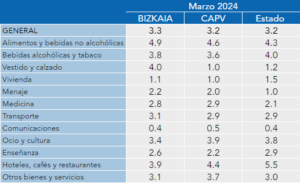Según datos publicados por el Instituto Nacional de Estadística (INE) en el mes de marzo, Bizkaia, la CAPV y el conjunto del Estado presentan una tasa de variación interanual del IPC del 3.3%, 3.2% y 3.2% respectivamente. Resaltamos que el sector de los alimentos se posiciona como grupo de influencia muy significativa en los tres territorios analizados. Sin embargo, el sector de la vivienda y de la energía sorprende que se siga situando en términos positivos por segunda vez consecutiva.