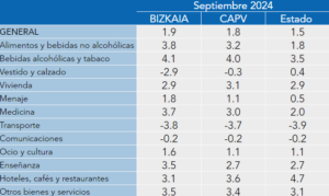Según datos publicados por el Instituto Nacional de Estadística (INE) en el mes de septiembre, Bizkaia, la CAPV y el conjunto del Estado presentan una tasa de variación interanual del IPC del 1,9%, 1,8% y 1,5% respectivamente. Resaltamos que el sector de los alimentos se posiciona como grupo de influencia muy significativa en los tres territorios analizados.