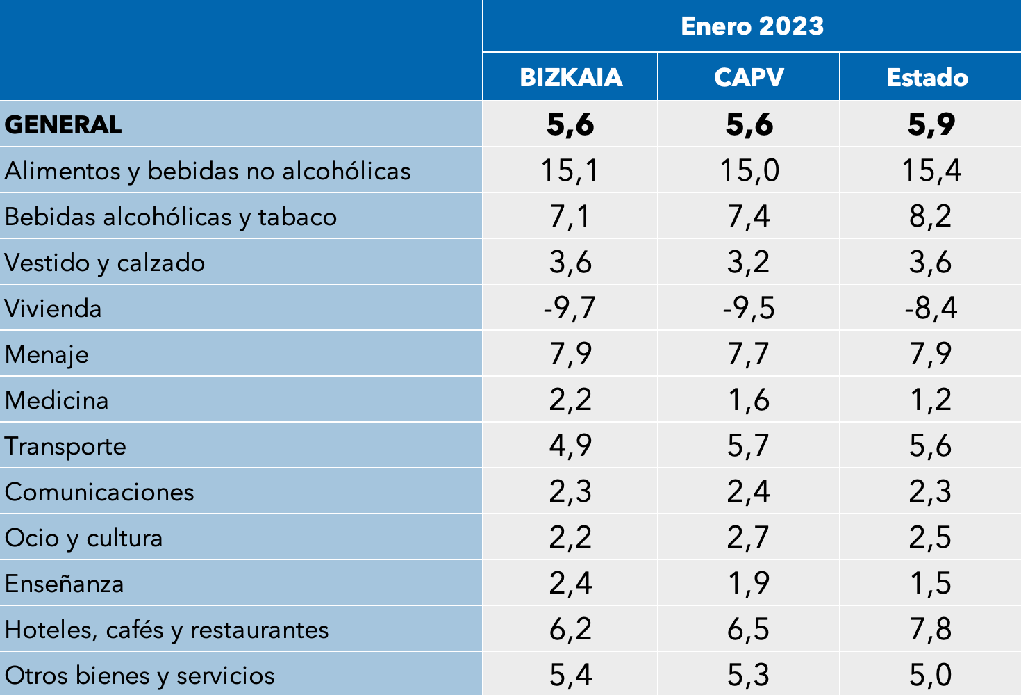 Según datos publicados por el Instituto Nacional de Estadística (INE) en el mes de enero, Bizkaia, la CAPV y el Estado presentan una tasa de variación interanual del IPC del 5,6 ; 5,6 y 5,9 respectivamente. El sector de los alimentos se posiciona como grupo de influencia muy significativa en los tres territorios analizados. Sin embargo, el sector de la vivienda sigue situándose en índices negativos.