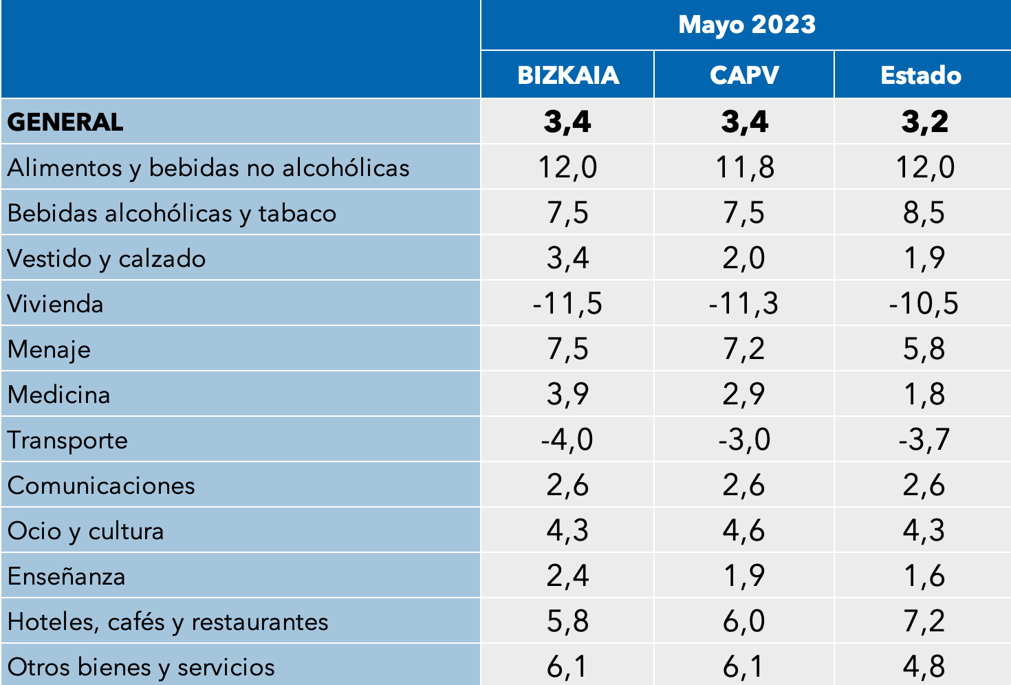 Según datos publicados por el Instituto Nacional de Estadística (INE) en el mes de mayo, Bizkaia, la CAPV y el Estado presentan una tasa de variación interanual del IPC del 3,4 ; 3,4 y 3,2 respectivamente. Resaltar que el sector de los alimentos se posiciona como grupo de influencia muy significativa en los tres territorios analizados. Sin embargo, el sector de la vivienda sigue situándose en índices negativos.