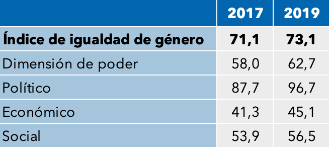 La diferencia entre 2017 y 2019 evidencia que la igualdad regulada (política) no solo es mayor que la económica y social (desreguladas), sino que es la que más rápido evoluciona hacia la igualdad total.