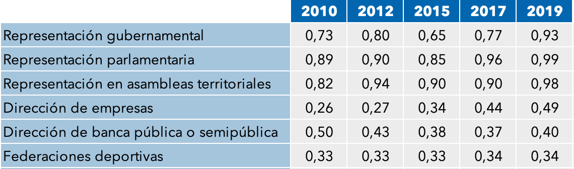 La brecha de género por componentes del IIG es una escala que va de 0 a 1, siendo 0 total desigualdad y 1 total igualdad. Observamos nuevamente la gran diferencia que existe entre los ámbitos de poder público/político y el privado/económico. No obstante, en esta tabla llama la atención el dato de las federaciones deportivas, que es el más alejado de la igualdad.