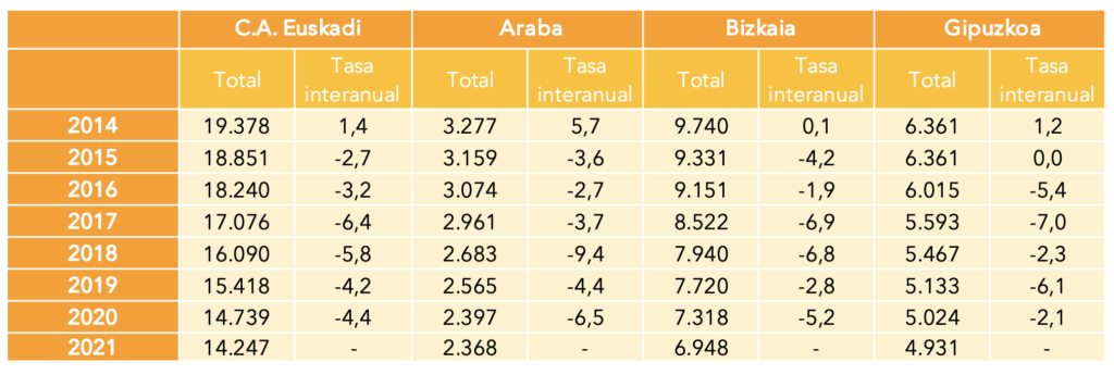 En los datos publicados por EUSTAT se aprecia una tasa de natalidad decreciente desde 2015, con tasas interanuales especialmente negativas en Bizkaia y Araba.