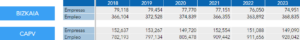 A principios del año 2023, el número de empleados totales tanto en Bizkaia como en Euskadi ha sido superior al del periodo anterior, manteniendo una constante tendencia alcista. Sin embargo, en lo que al número de empleadores corresponde, el número de empresas en ambas divisiones ha sido inferior al principio del 2023 que al principio del 2022.