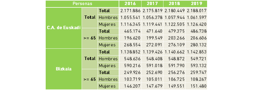 Según publica EUSTAT, los datos muestran un aumento progresivo anual del número de personas en ambos Territorios entre las personas de edad igual o superior a 65 años.
