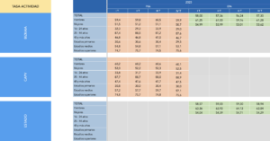 De acuerdo con la PRA, la tasa de actividad alcanza el 59,9 % entre los hombres y el 50,7 % entre las mujeres, manteniendo una brecha de algo más de nueve puntos. La actividad es especialmente elevada entre las personas de 25 a 44 años (87,6 %) y quienes cuentan con estudios superiores (75,6 %), mientras que desciende con fuerza entre los jóvenes de 16 a 24 años (29,0 %) y la población con estudios primarios (29,5 %).
