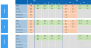 Según EUSTAT, la tasa de ocupación total disminuye ligeramente en la CAPV y Bizkaia. La EPA muestra también un aumento en la tasa de ocupación en Bizkaia, CAPV y en la globalidad del estado. Esto va en coherencia con los datos proporcionados en relación al incremento en la tasa de actividad y descenso en la tasa de paro en datos proporcionados por EUSTAT e INE.