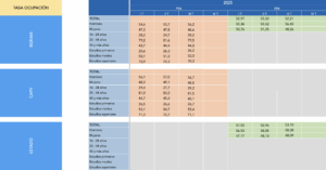 Por su parte, la EPA sitúa la tasa de ocupación del Estado en el 53,1 % en el tercer trimestre de 2025, con un 58,4 % entre los hombres y un 48,1 % entre las mujeres. En conjunto, los datos del tercer trimestre de 2025 reflejan un mercado de trabajo relativamente sólido en Bizkaia y Euskadi, aunque con una ligera pérdida de impulso y con diferencias de género y de nivel educativo que siguen siendo significativas.