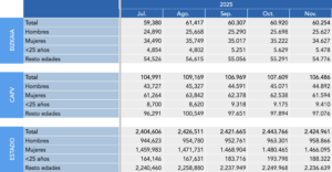 Según los últimos datos publicados por Eustat y el INE, el paro registrado en Bizkaia se situó en 60.254 personas en noviembre de 2025. En el conjunto de la CAPV, la cifra ascendió a 106.486 personas, mientras que a nivel estatal el número total de personas desempleadas fue de 2.424.961.