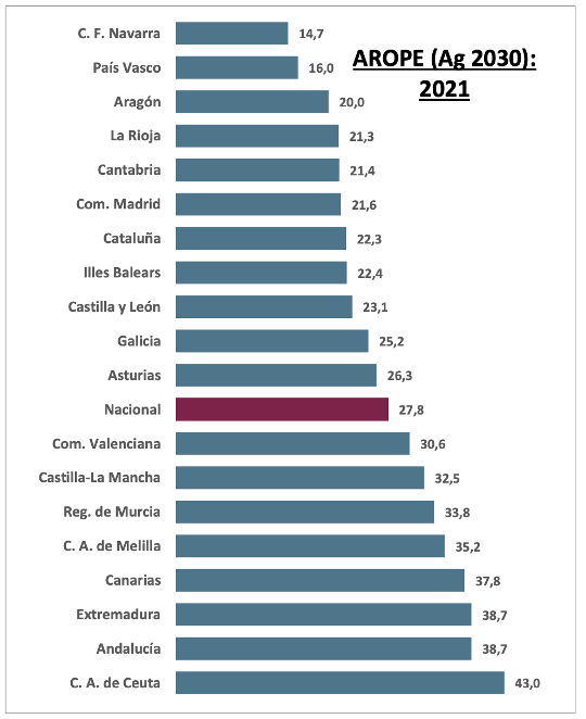 Las principales conclusiones obtenidas en el análisis del AROPE reflejan que la desigualdad territorial es muy elevada y existe una clara diferenciación Norte-Sur.