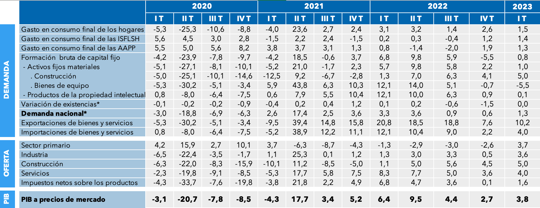 Los datos publicados por el INE reflejan cierta desaceleración del crecimiento en términos interanuales, en la mayoría de las partidas analizadas. Destaca como dato negativo por parte de la demanda la formación los bienes de equipo. La contribución de la demanda nacional al crecimiento interanual del PIB es de 1,3 puntos, seis décimas superior a la del trimestre anterior.