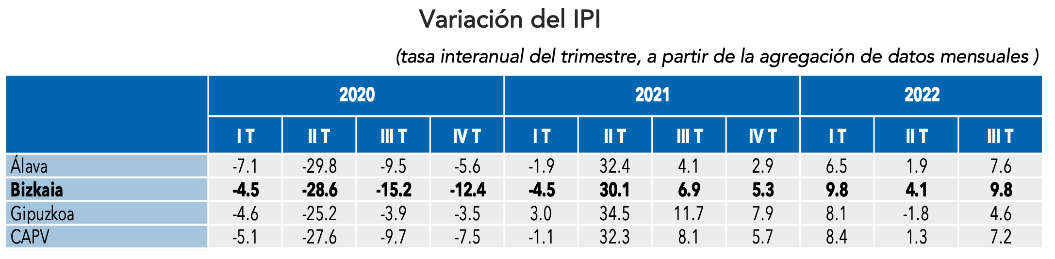 Tal y como publica el Instituto Vasco de Estadística, la tasa interanual del índice de producción industrial (IPI) del tercer trimestre del 2022 se muestra al alza en Bizkaia, Álava y la CAPV.