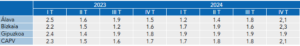 Según datos de la tasa interanual del PIB publicados por el Instituto Vasco de Estadística, (EUSTAT) el PIB se sitúa en términos interanuales positivos, siendo Gipuzkoa el territorio con un crecimiento algo inferior, pero teniendo todos los territorios un crecimiento bueno.