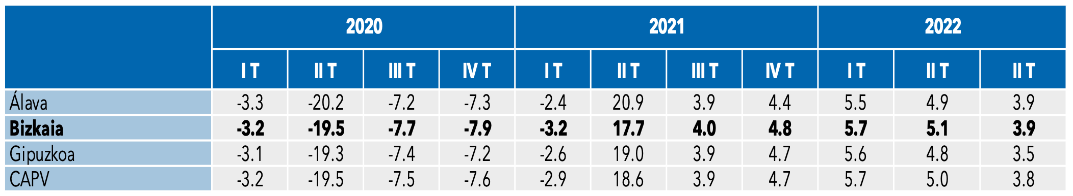Según datos de la tasa interanual del PIB publicados por el Instituto Vasco de Estadística, (EUSTAT) el PIB se sitúa en términos interanuales positivos, siendo el crecimiento equilibrado en los tres territorios.